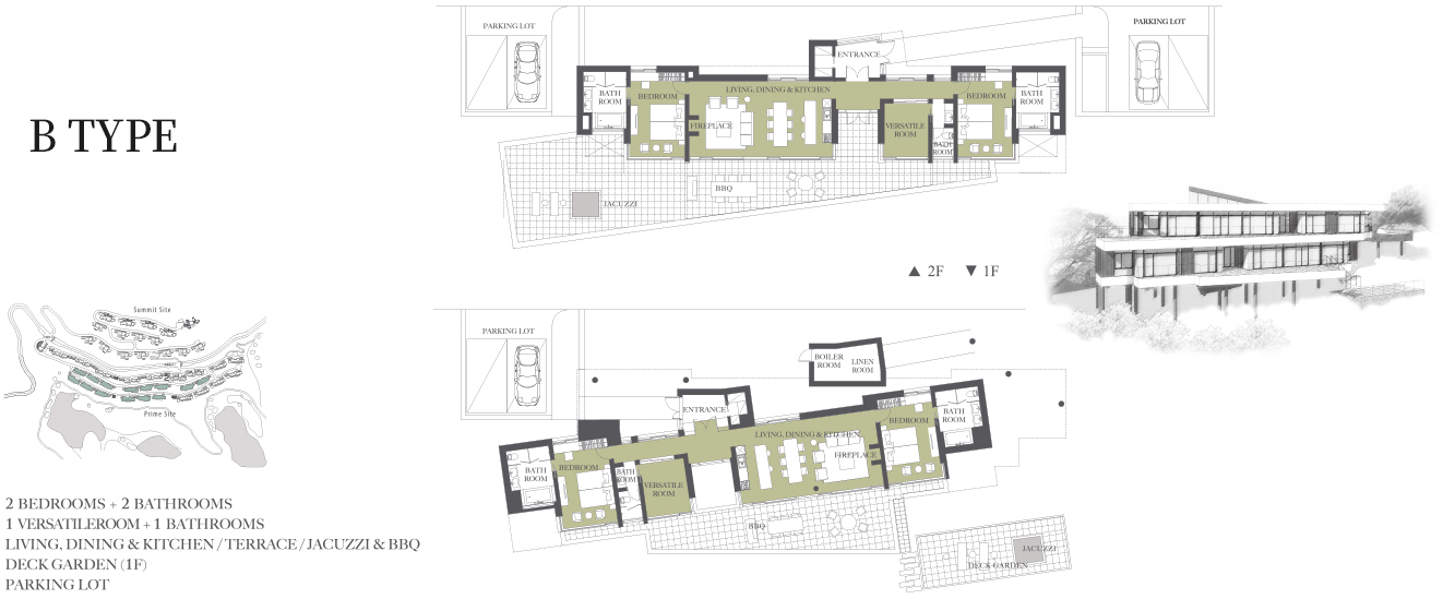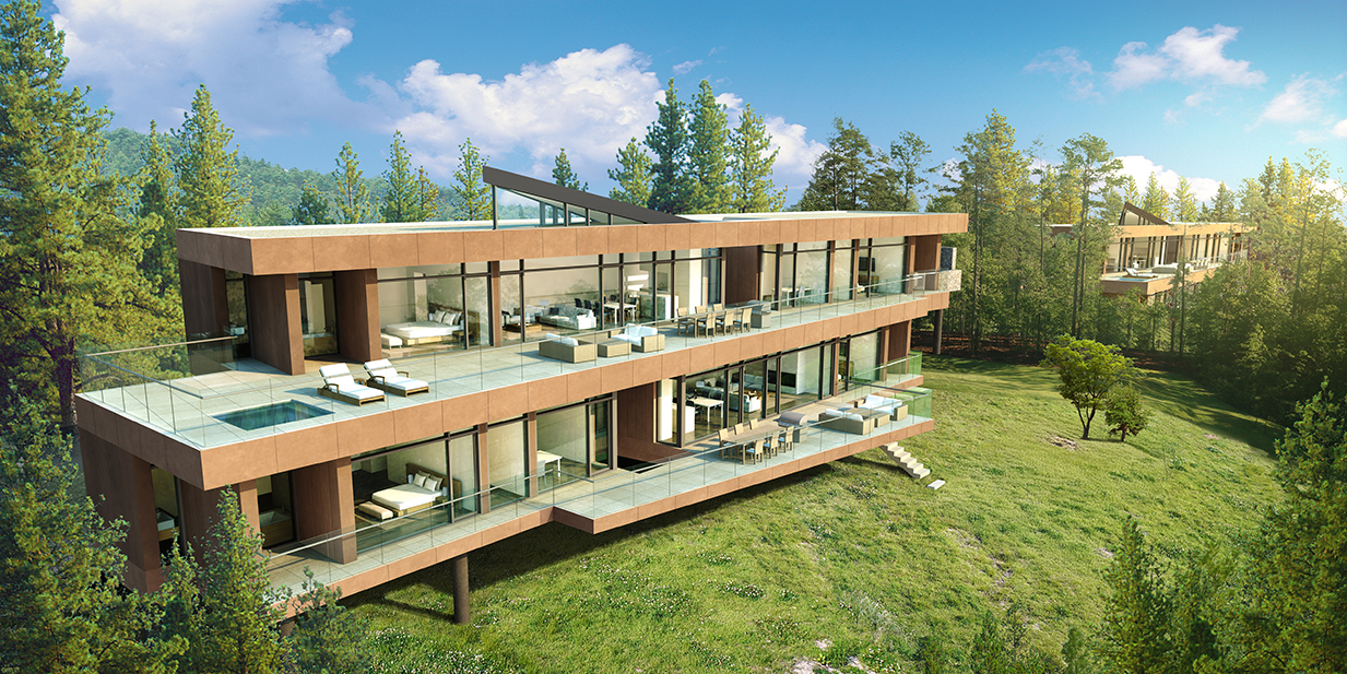 전면 전체가 창으로 계획되어, 넓은 테라스를 자유롭게 드나들며 사계절에 걸쳐 펼쳐지는 대자연의 파노라마를 누릴 수 있고 야외 자쿠지, 야외 라운지, 야외 식당 등으로 자연과 함께하는 삶을 누릴 수 있다.