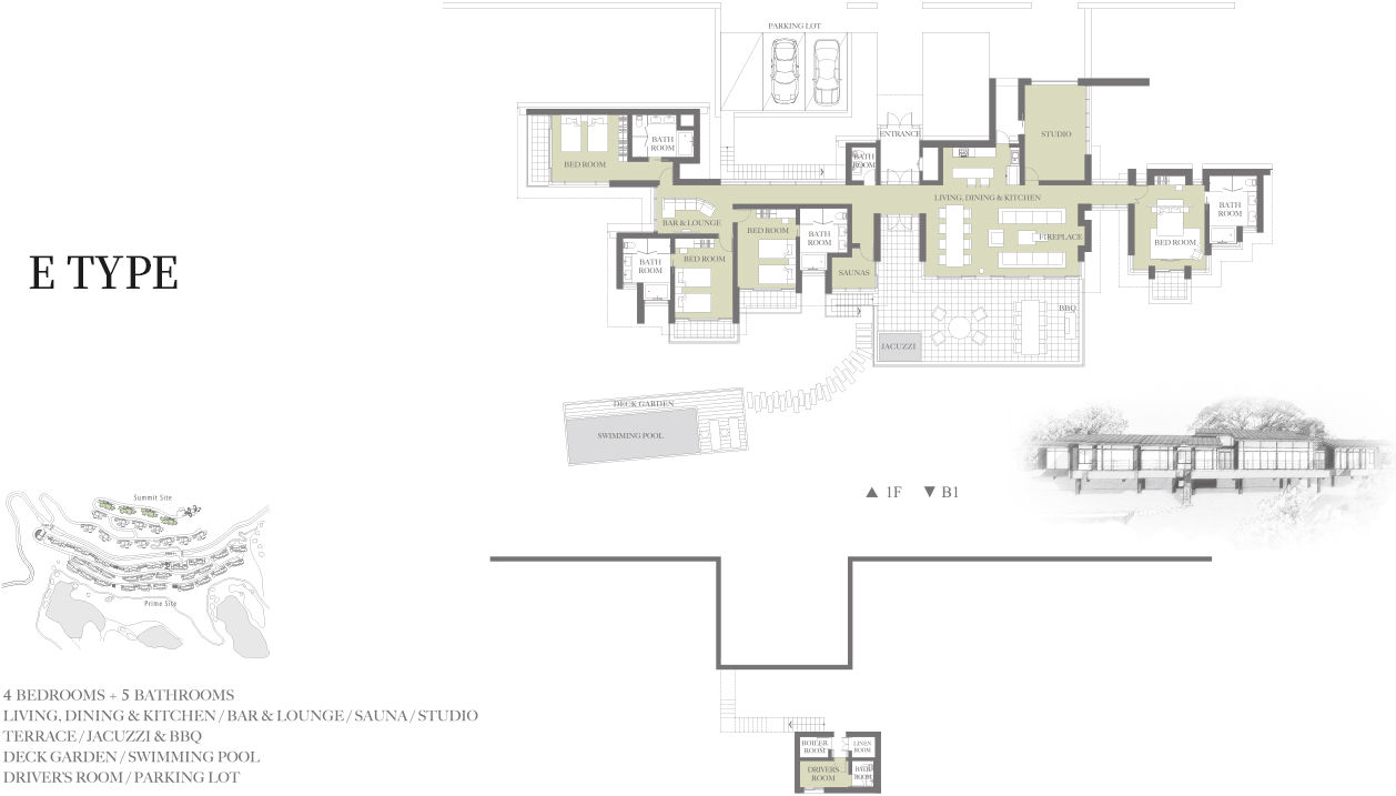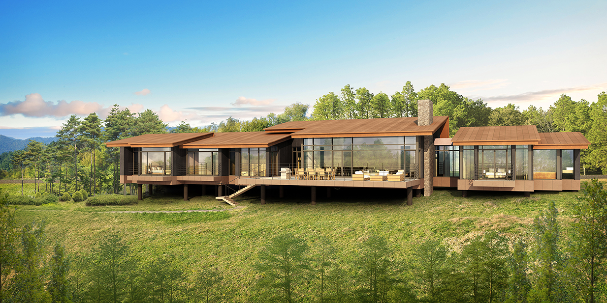 공간전체를 단일 층으로 구성하였다. 현관을 들어서면 전면의 넓은 테라스 너머 장엄한 숲의 경관이 기다리고 있으며 전용의 찜질방과 야외 자쿠지 등이 시설되어 있어 사계절 내내 다양한 스타일을 누릴 수 있도록 되어있다.