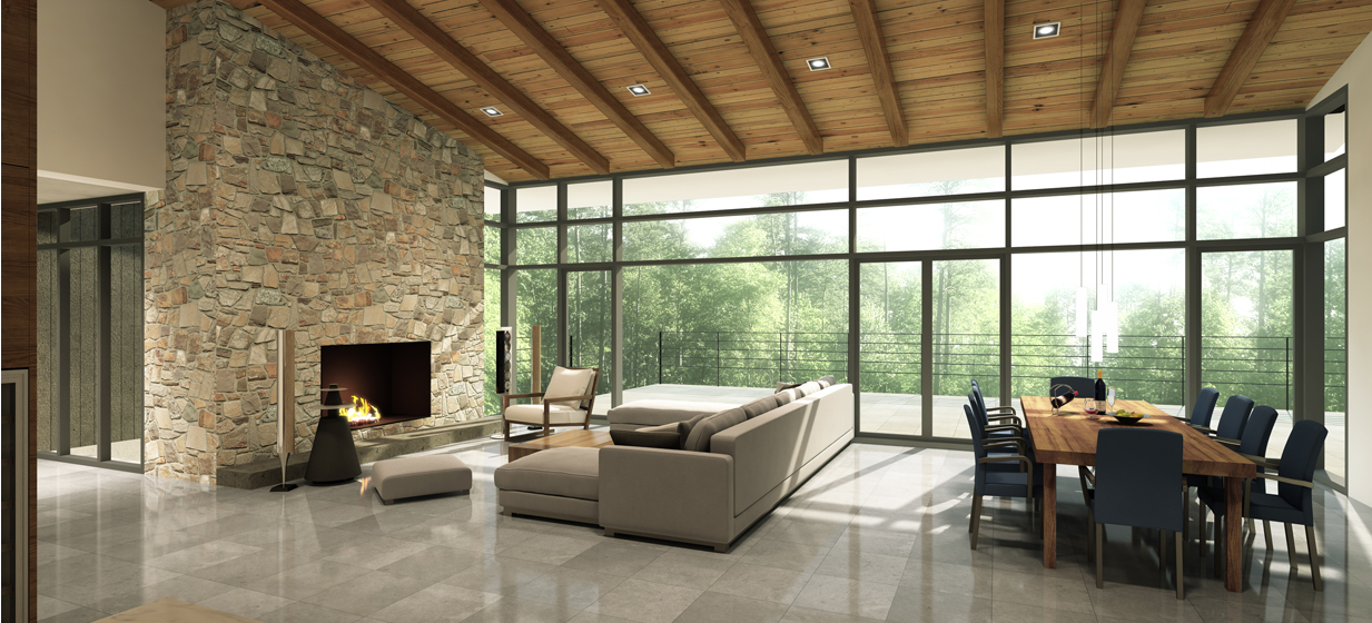 테라스 너머 장엄한 숲의 경관이 펼쳐지며 넓은 전면창이 이 모든 풍경을 실내로 끌어 들인다