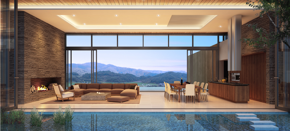 앞뒤의 초대형 유리문을 활짝 열면, 넓은 테라스 너머로 골프장과 멀리 백덕산, 사자산, 덕어산 등 백두대간이 펼쳐지고, 뒤쪽으로는 산자락을 타고 훌러내리는 숲의 향기가 쏟아져 들어온다.